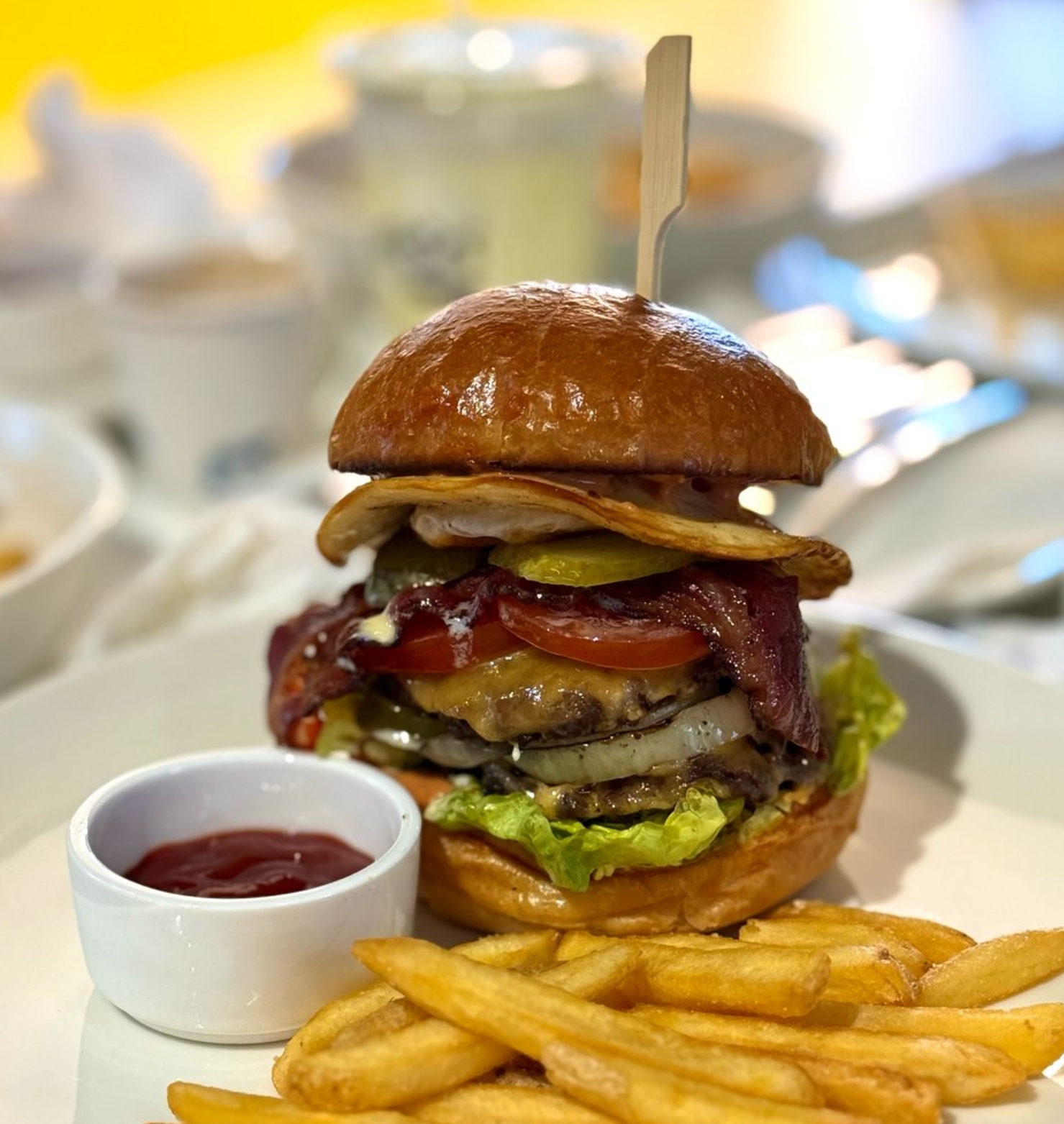 Two minced mushroom & chicken patties, cheddar cheese, pickle, grilled onion, dijon mayo sauce, lettuce, brioche bun, served with fries.